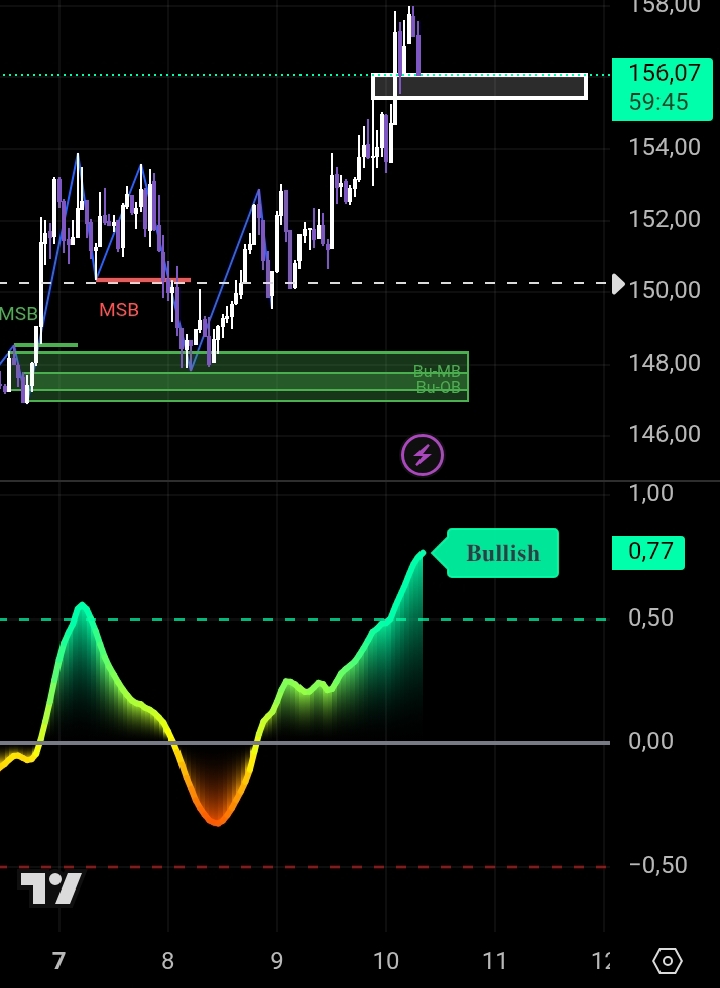 - Harga menembus zona Bu-OB & Bu-MB di sekitar $148 dan terus naik.