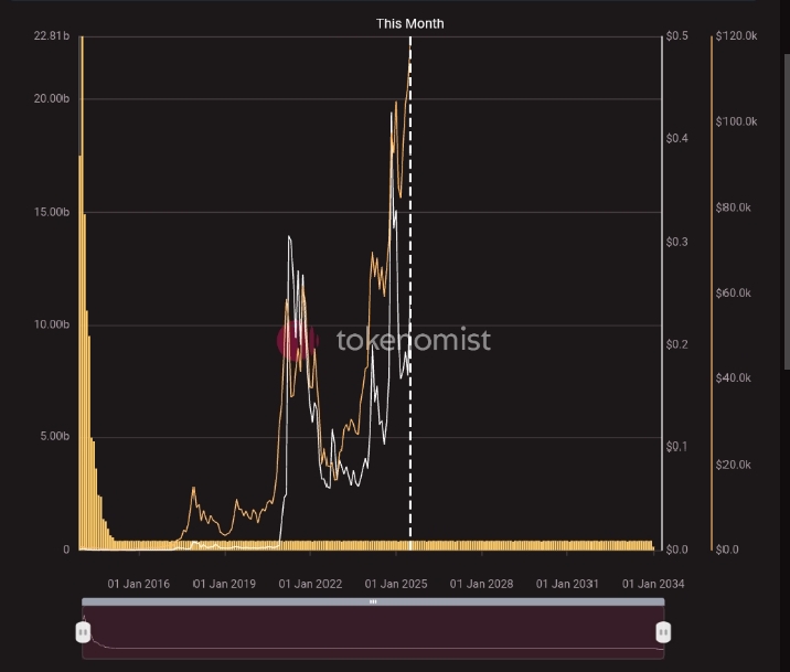 Sumber data grafik: tokenomist.ai/dogecoin (2025)